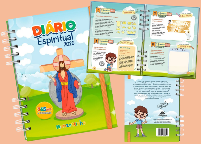 Depois de se tornar um sucesso entre os adultos, o Diário Espiritual ganhou uma versão infantil pensada especialmente para evangelizar as crianças com leveza e alegria. O Diário Espiritual Infantil 2026, inspirado na identidade da Turma do Manzottinho, traz atividades lúdicas, reflexões simples, orações mensais e um espaço afetuoso para a criança aprender a rezar e falar com Deus.
