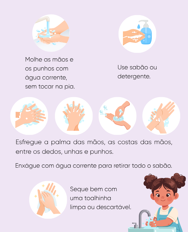 Este processo deve durar, pelo menos, de 20 a 30 segundos. Caso não seja possível lavar as mãos com água e sabão, use álcool gel 70%.
