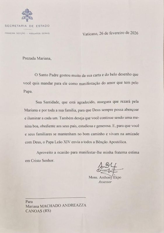 Ao final da mensagem, o Santo Padre concede a Bênção Apostólica e reforça o desejo de que Mariana e seus familiares permaneçam no caminho do bem e na amizade com Deus. A carta foi assinada por Monsenhor Anthony Ekpo, assessor da Secretaria de Estado.