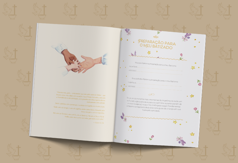 Delicadamente ilustrado por Marcia Misawa, a proposta é que a família guarde, com carinho, o início da relação entre a criança e Deus, com espaço para textos, registros, fotos e anotações da celebração batismal.