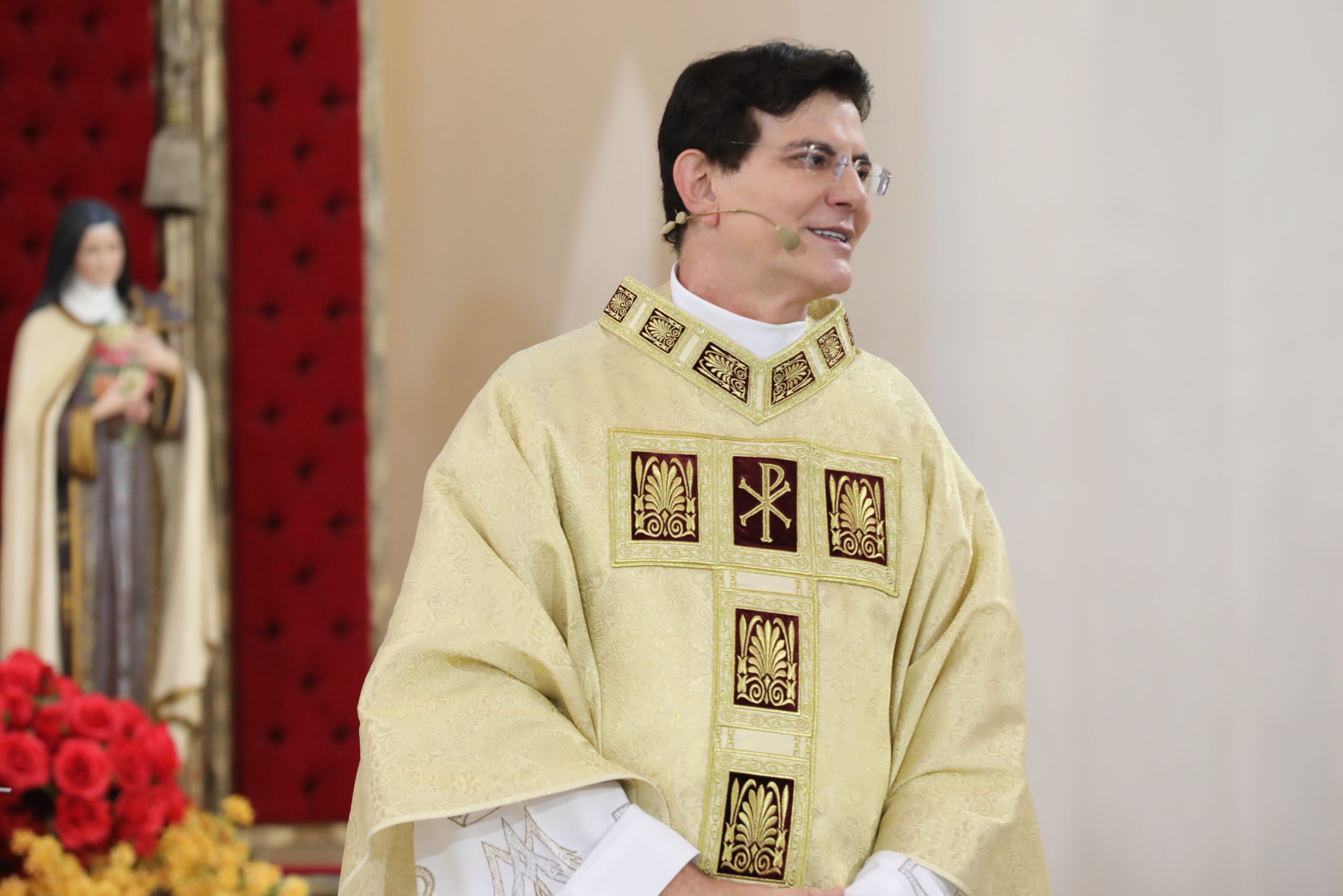 Veste do Padre Reginaldo Manzotti exibe o símbolo cristão./Foto: Felipe Gusso