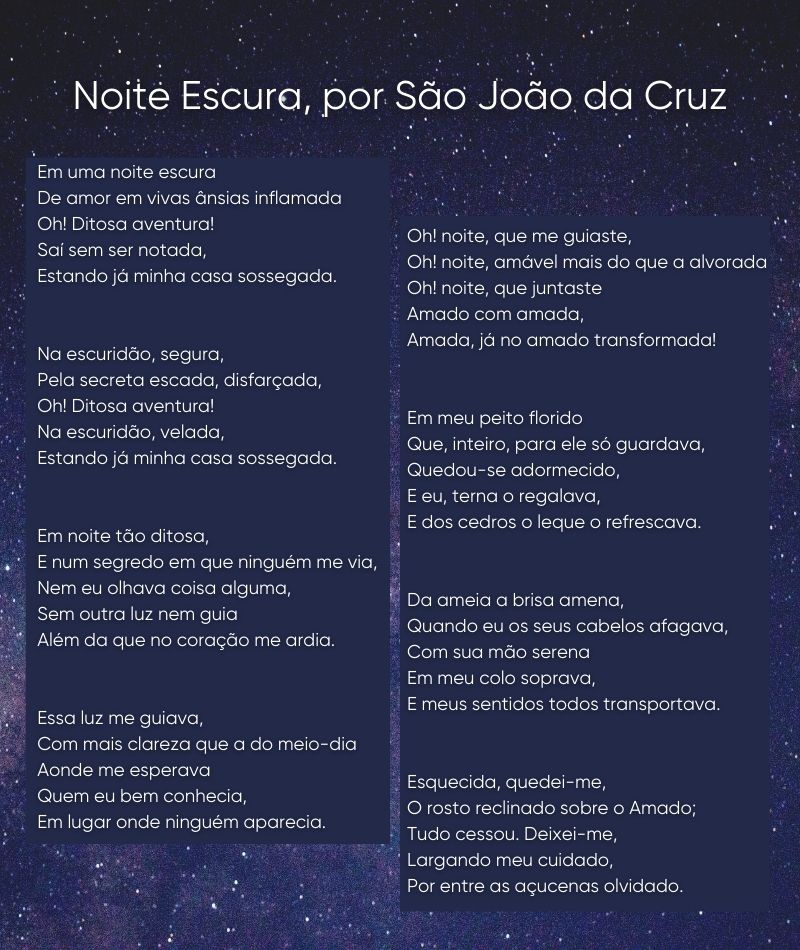 Seu exemplo está no caminho de purificação e união com Deus que ele descreveu com profundidade teológica e beleza poética. Seus escritos, como Subida do Monte Carmelo, Noite Escura da Alma, Cântico Espiritual e Chama Viva de Amor, apresentam o itinerário da alma que deseja alcançar a união plena com o Amado.